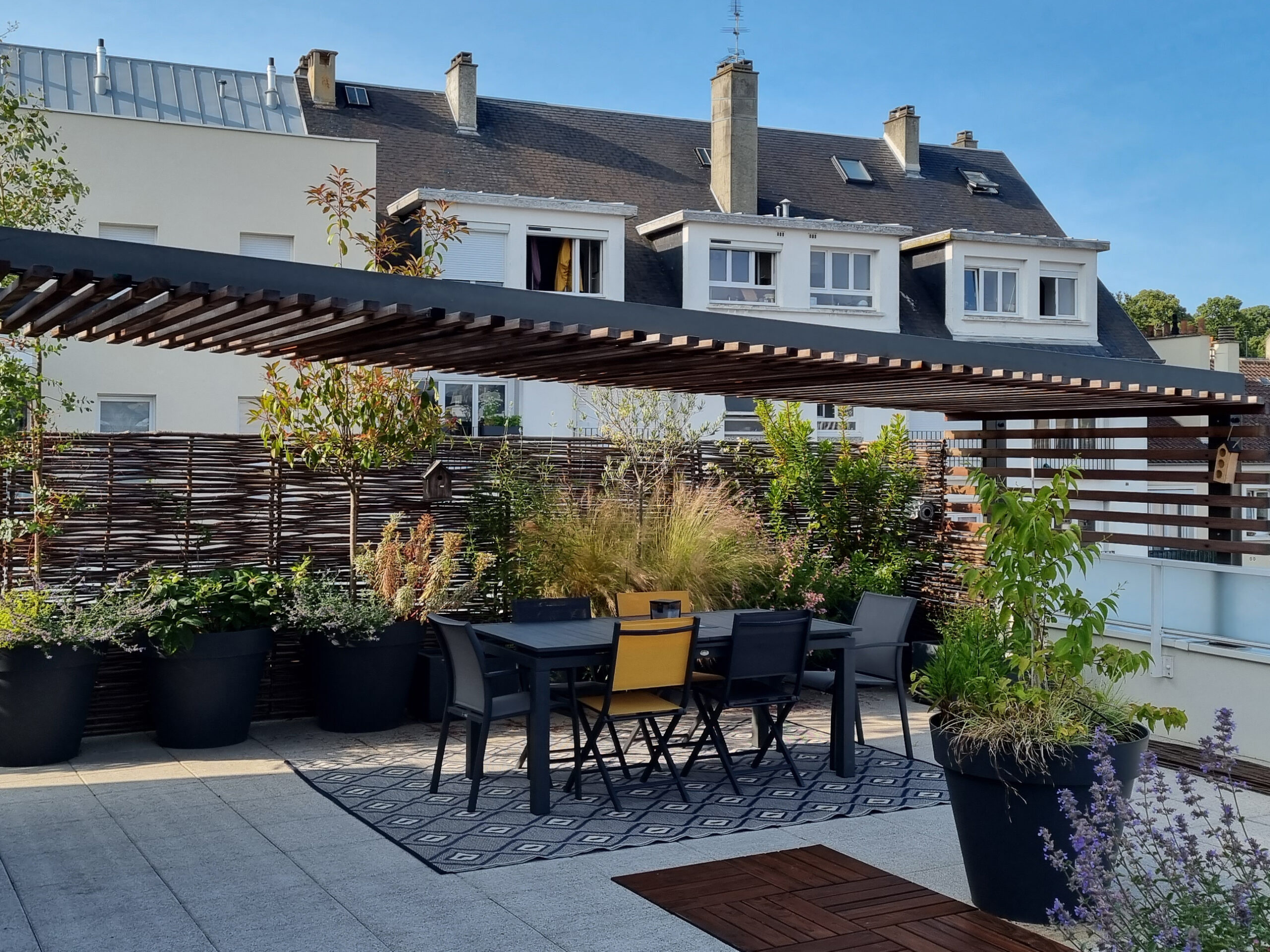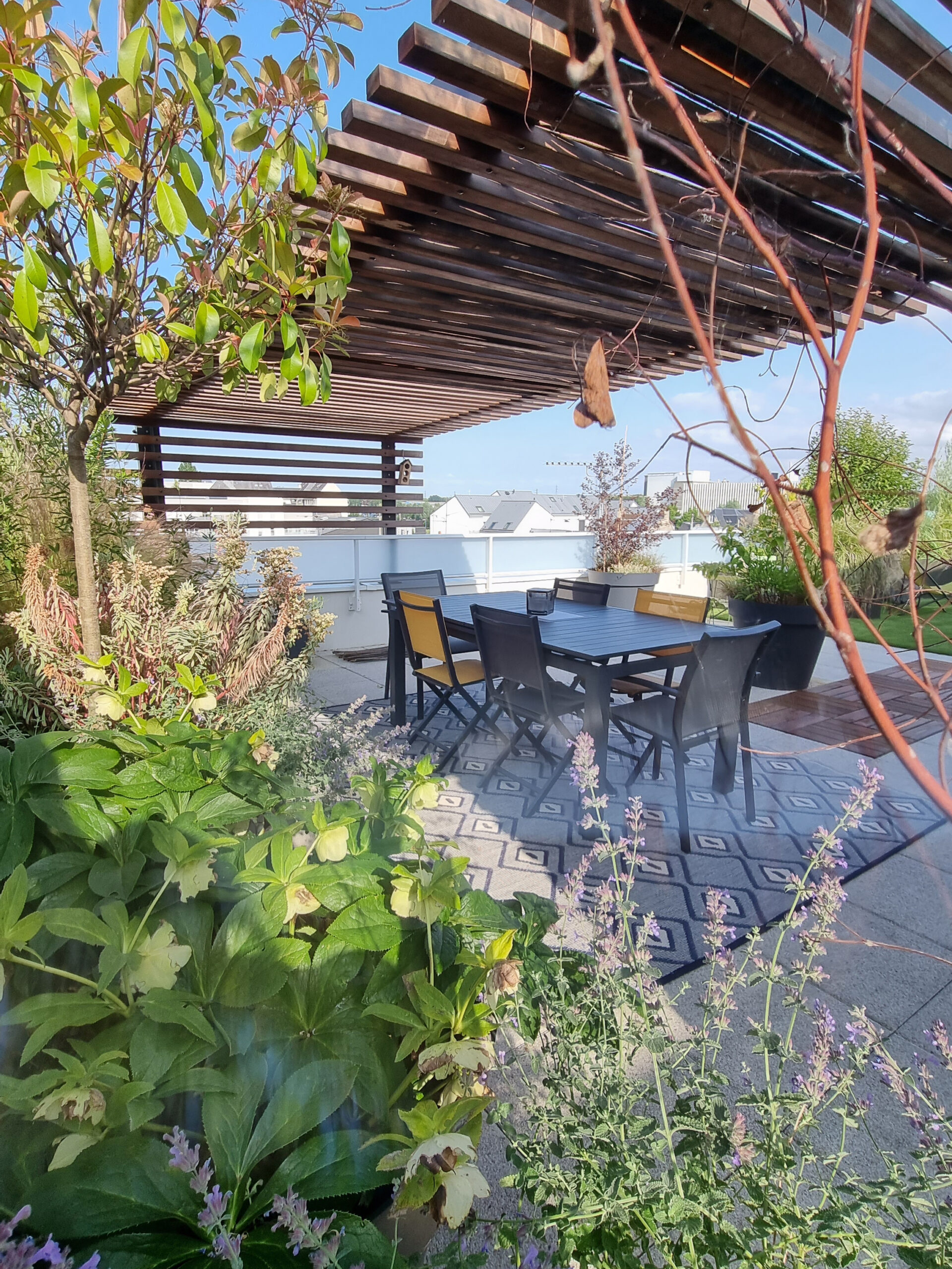 Afin de créer une transition vers une ambiance différente, des caillebotis en bois, de la même taille que les dalles gravillonnées, ont été posés pour mener vers l’espace repas. Des panneaux en branches de noisetier tressées ont été utilisés comme claustras pour préserver l’intimité autour du coin repas, et une grande pergola sur mesure en structure métallique et tasseaux de bois a été installée pour contrer les regards indiscrets.