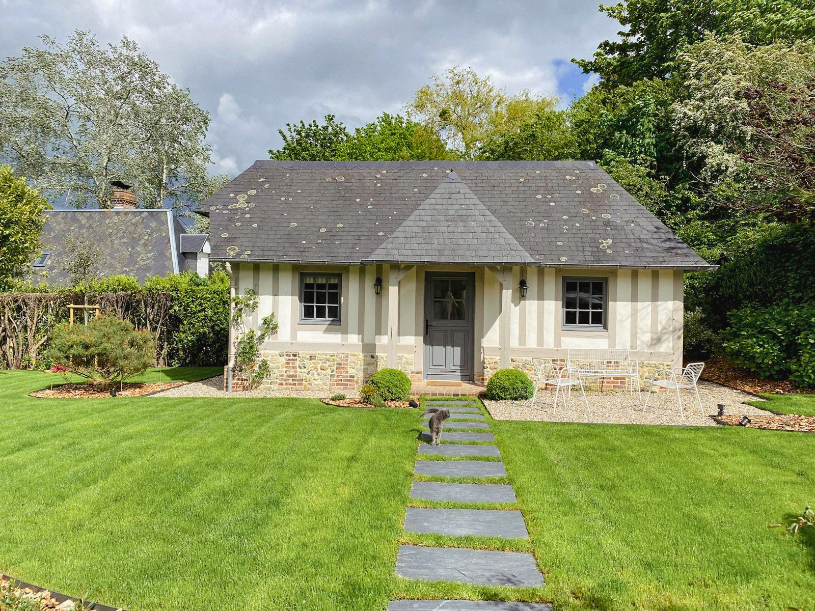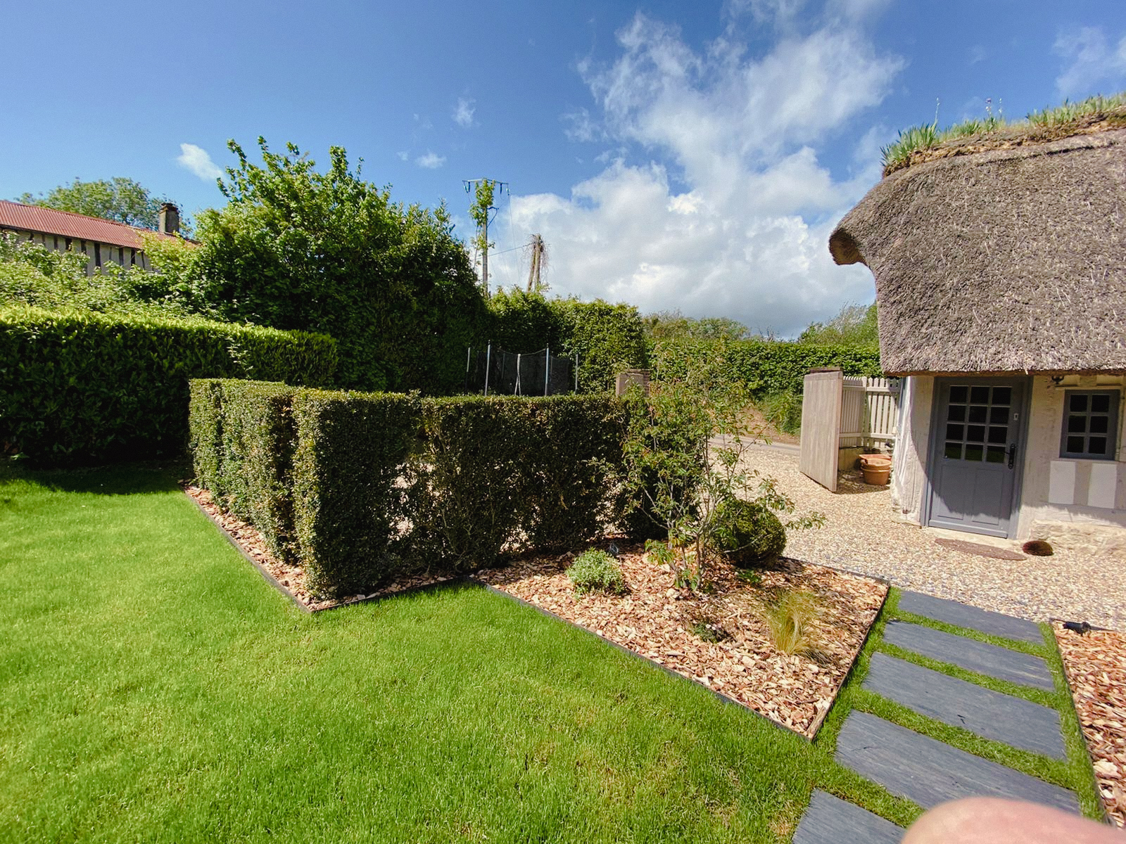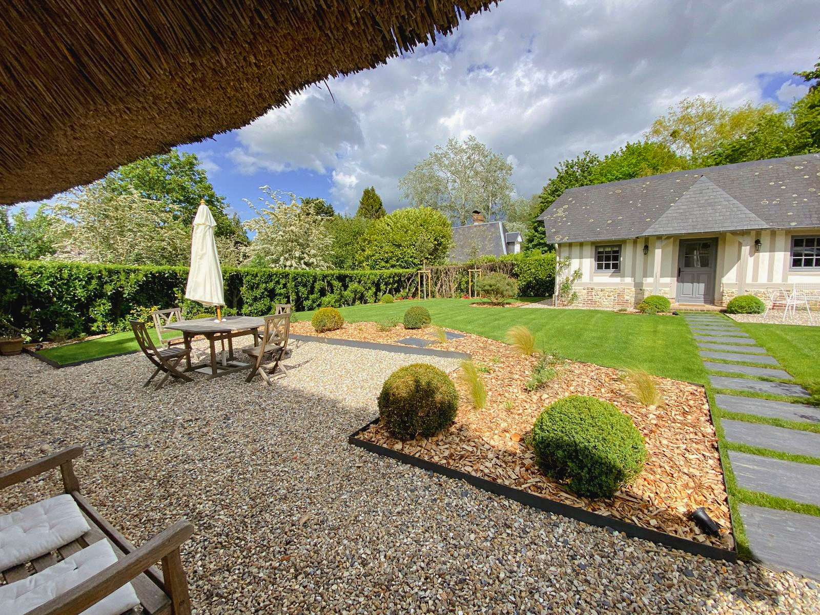 Cette charmante chaumière devait revoir son jardin après un changement d’assainissement. Des massifs ont été créés pour dissimuler les regards aussi gros qu’inesthétiques.Pour agrandir l’espace et se rendre à la maison d’amis, l’option allée en pas japonnais de schiste a été retenue.