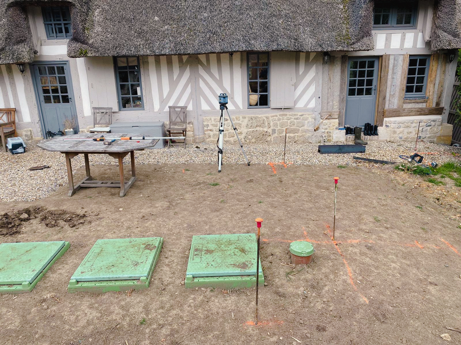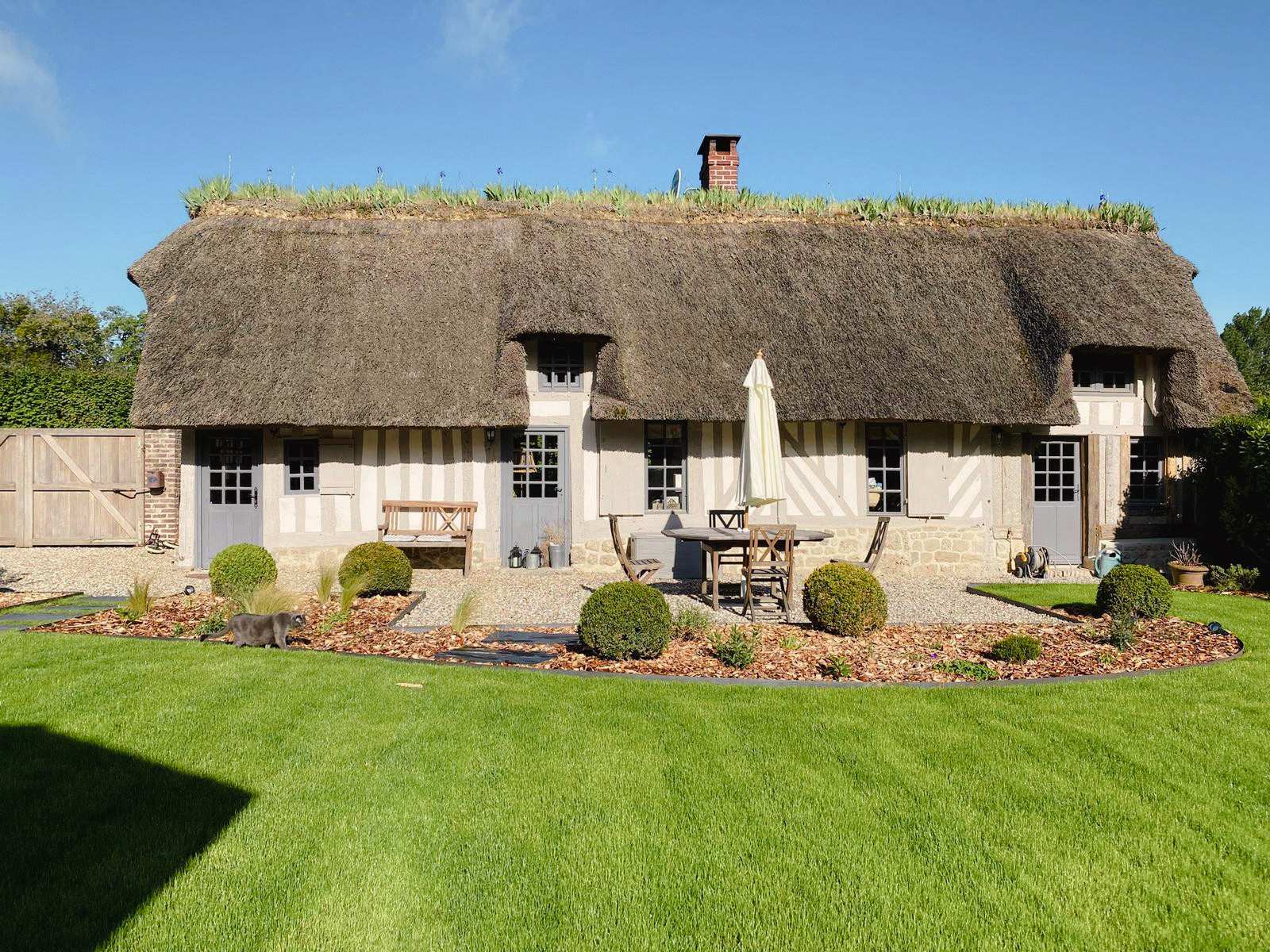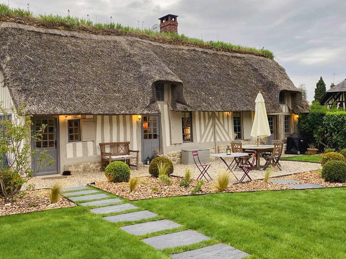 Cette charmante chaumière devait revoir son jardin après un changement d’assainissement. Des massifs ont été créés pour dissimuler les regards aussi gros qu’inesthétiques.Pour agrandir l’espace et se rendre à la maison d’amis, l’option allée en pas japonnais de schiste a été retenue.