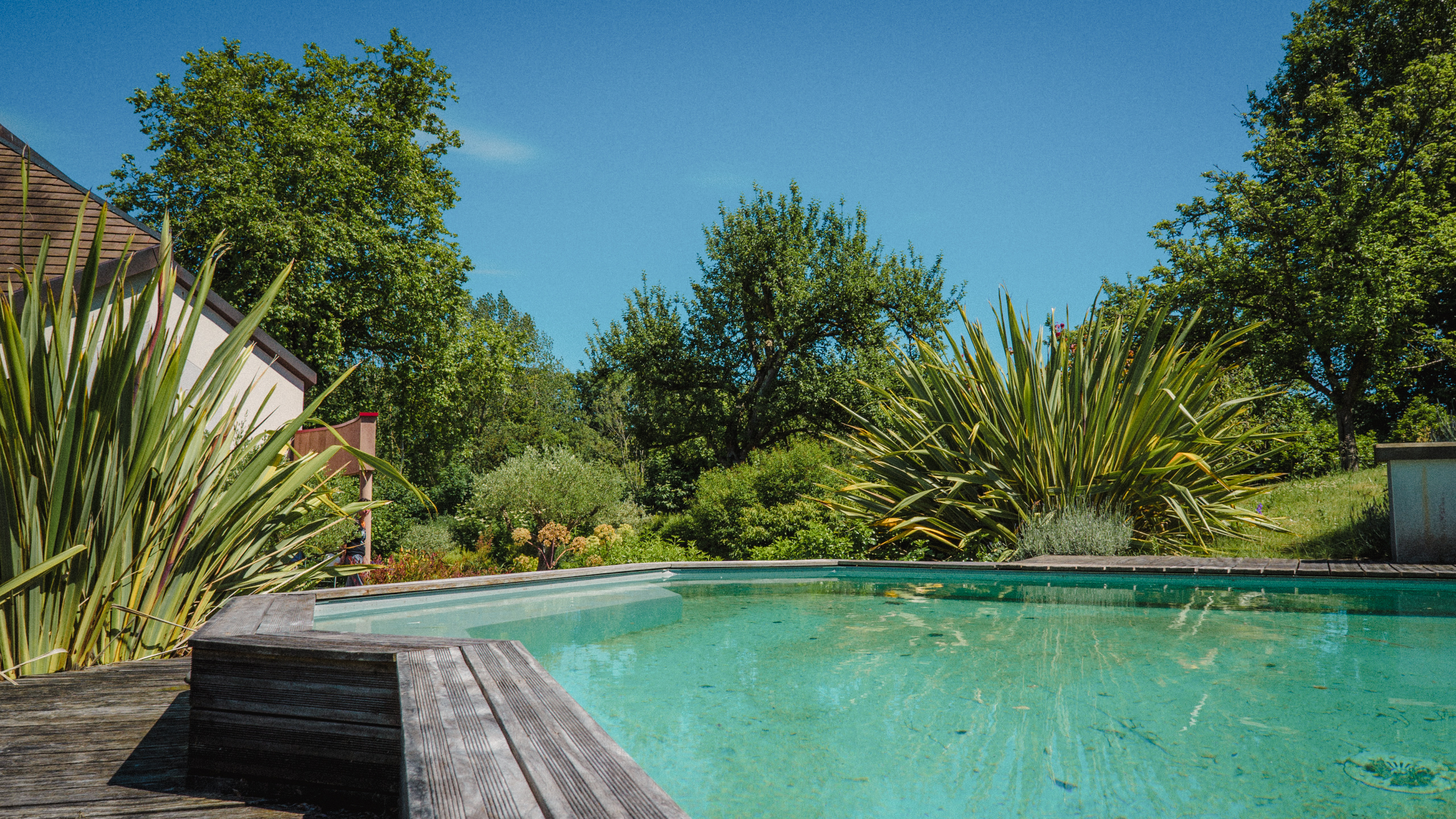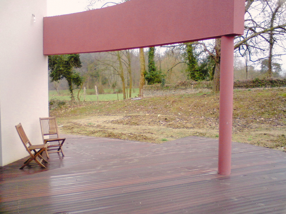 Ce grand jardin entièrement crée pour cette maison d’architecte très moderne, était sur 2 niveaux. Un champ de pommiers en partie haute et une grande terrasse de plain-pied en partie basse. L’intégration d’une piscine était le souhait des clients, elle fut intégrée dans le talus.
