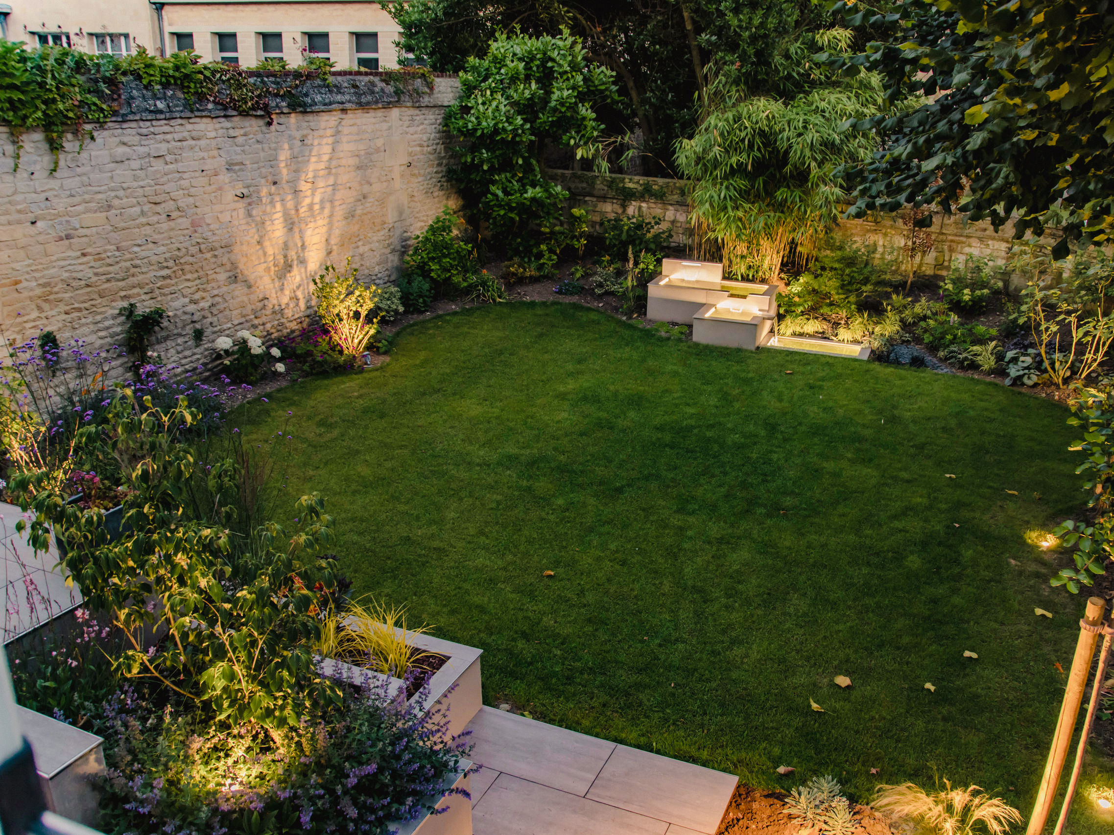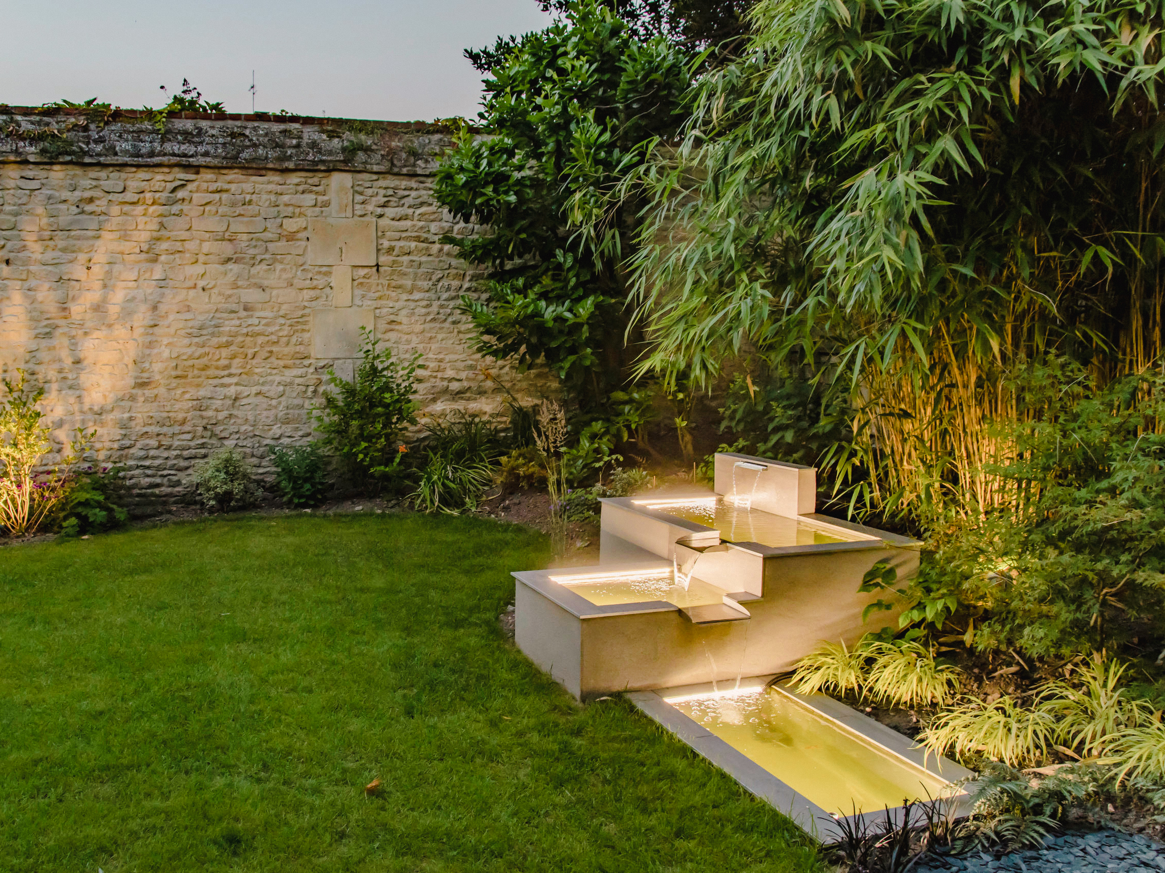 Les clients souhaitaient aussi un bassin avec des poissons, 3 bassins avec lames d’eau en cascade animent le fond du jardin. Les bambous et les graminées l’intègrent au mieux. Une fibre lumineuse à la surface de l’eau permet de l’admirer dès la nuit tombée.