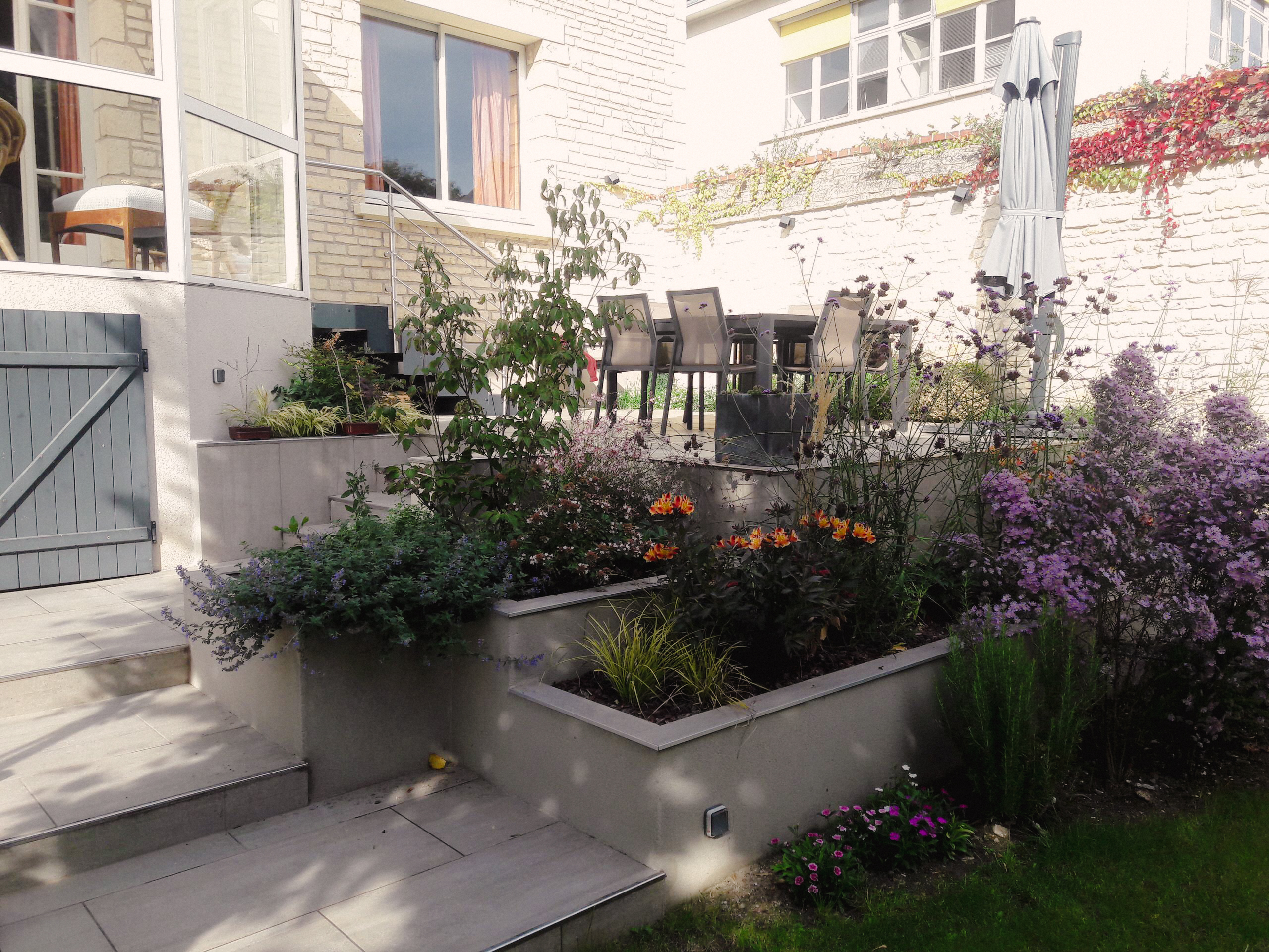 Le jardin à l’arrière de la maison était difficilement accessible, alors une terrasse rehaussée pour profiter des repas extérieur plus souvent et un escalier accompagné de grandes jardinières fleuries ont été construit.