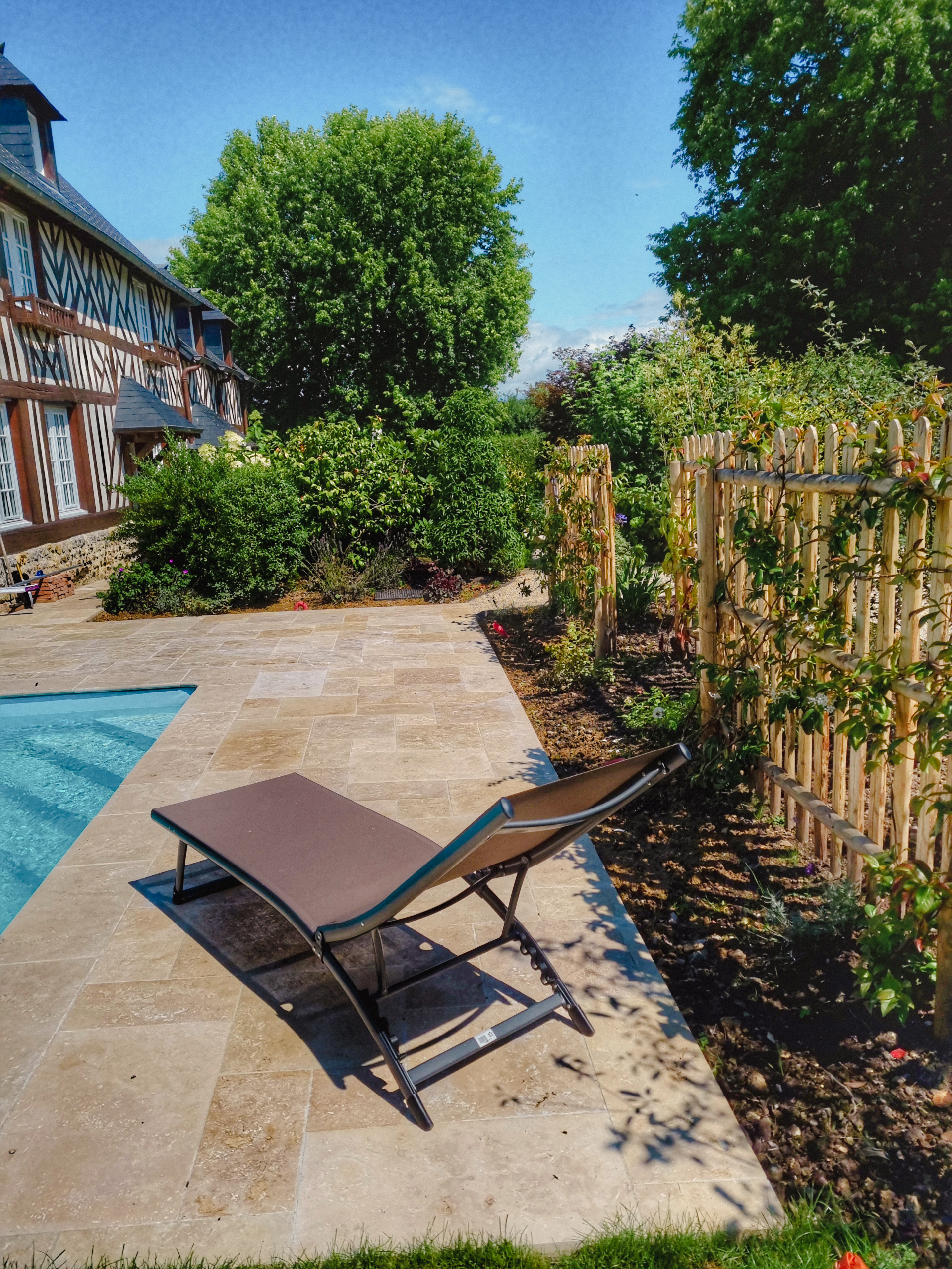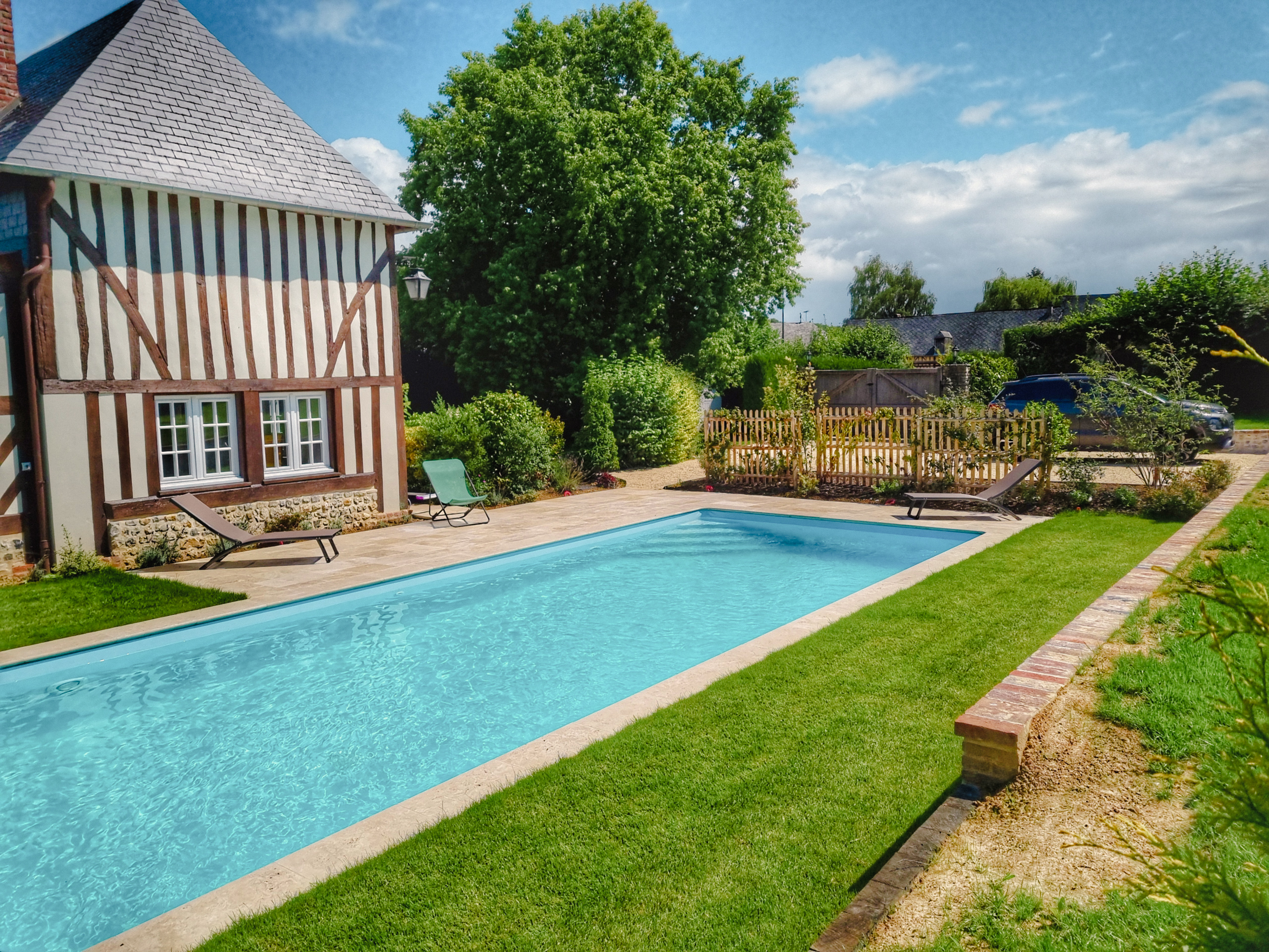 Les propriétaires de cette jolie maison à colombages du pays d’auge souhaitaient une piscine.