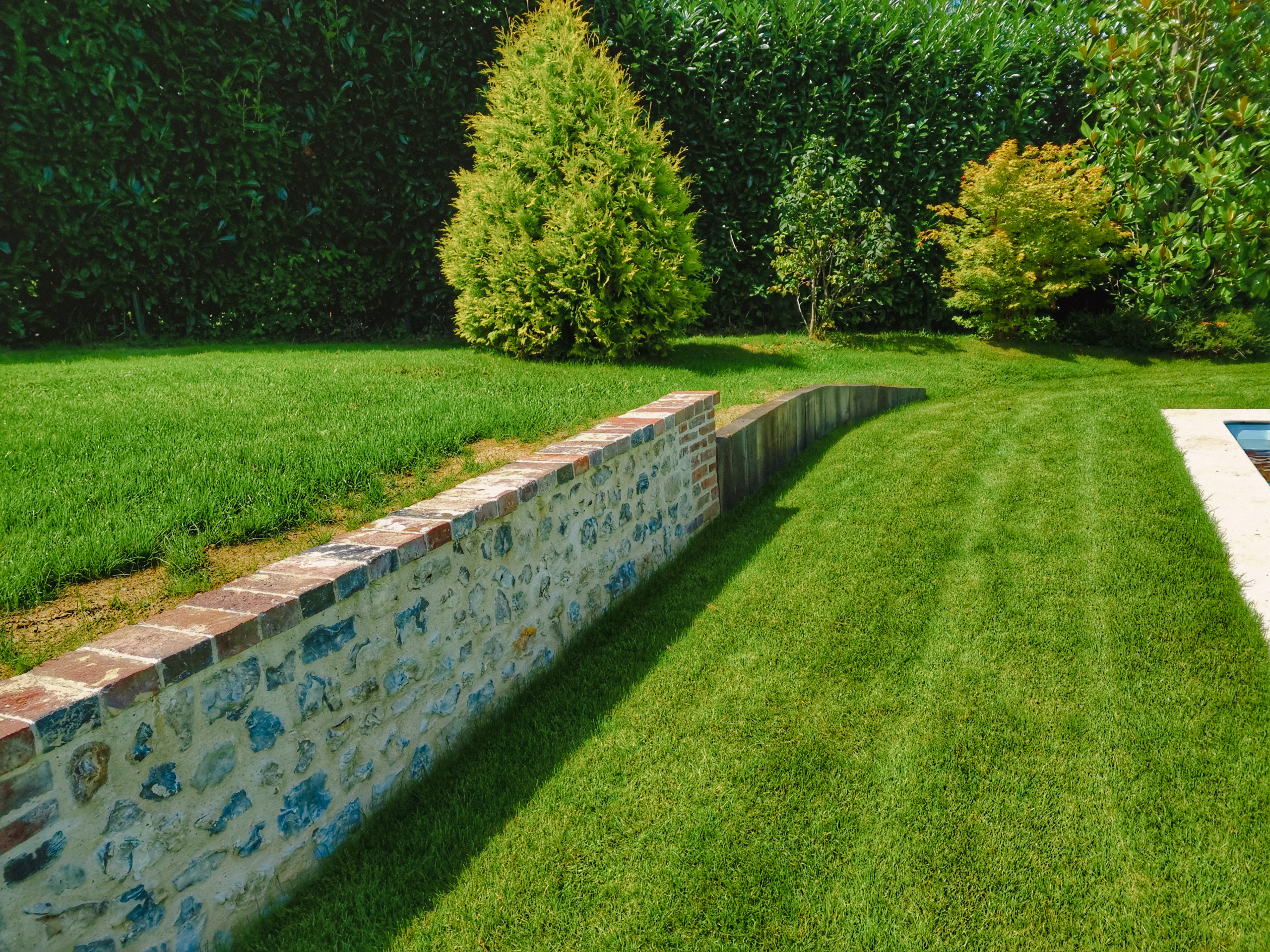 Un joli muret en silex et briques anciennes fut crée à la fois faisant office de banc et retenant la terre.