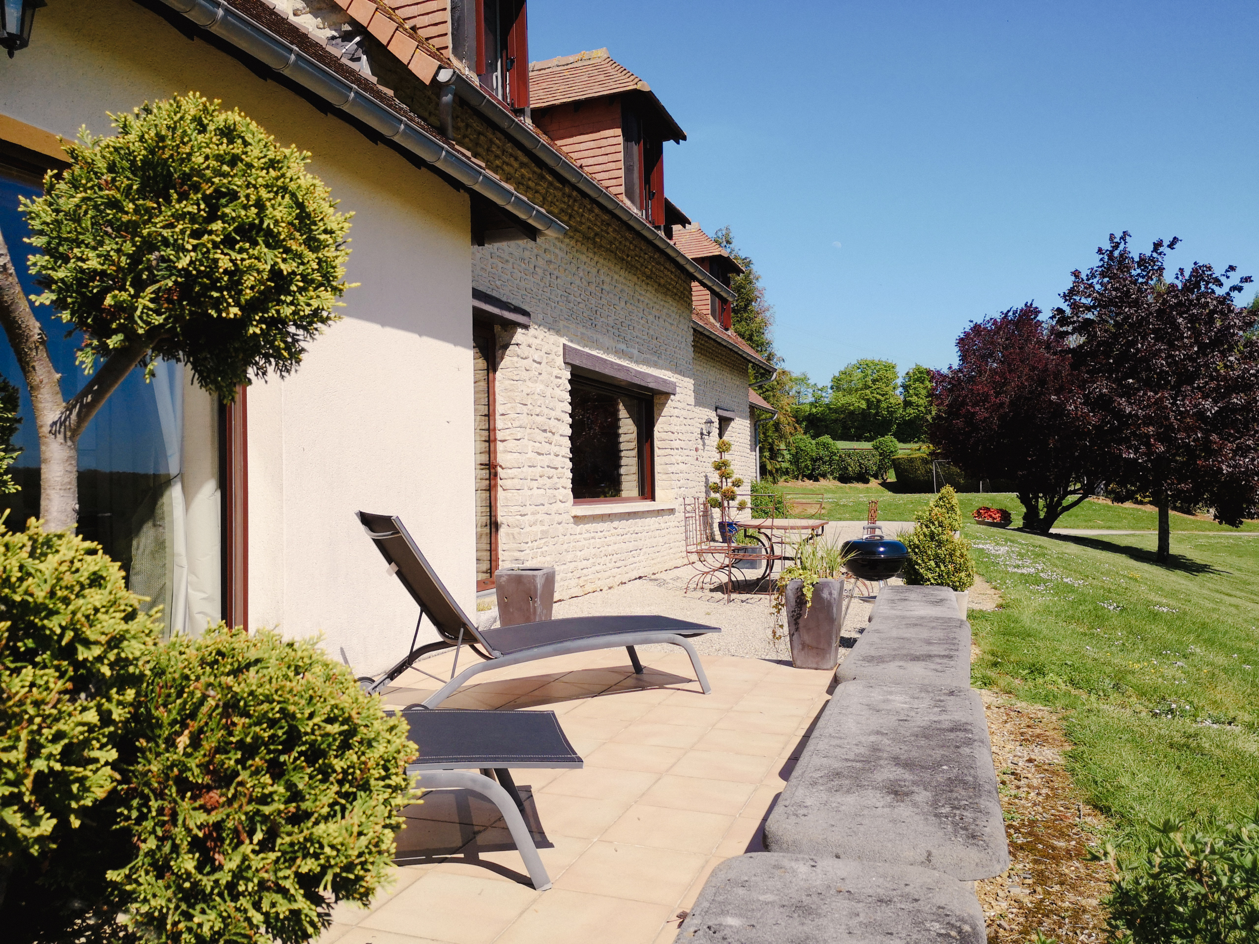 Les touches de végétations aux abords de la terrasse ont créé un trait d’union avec le paysage grandiose de cette vallée normande.