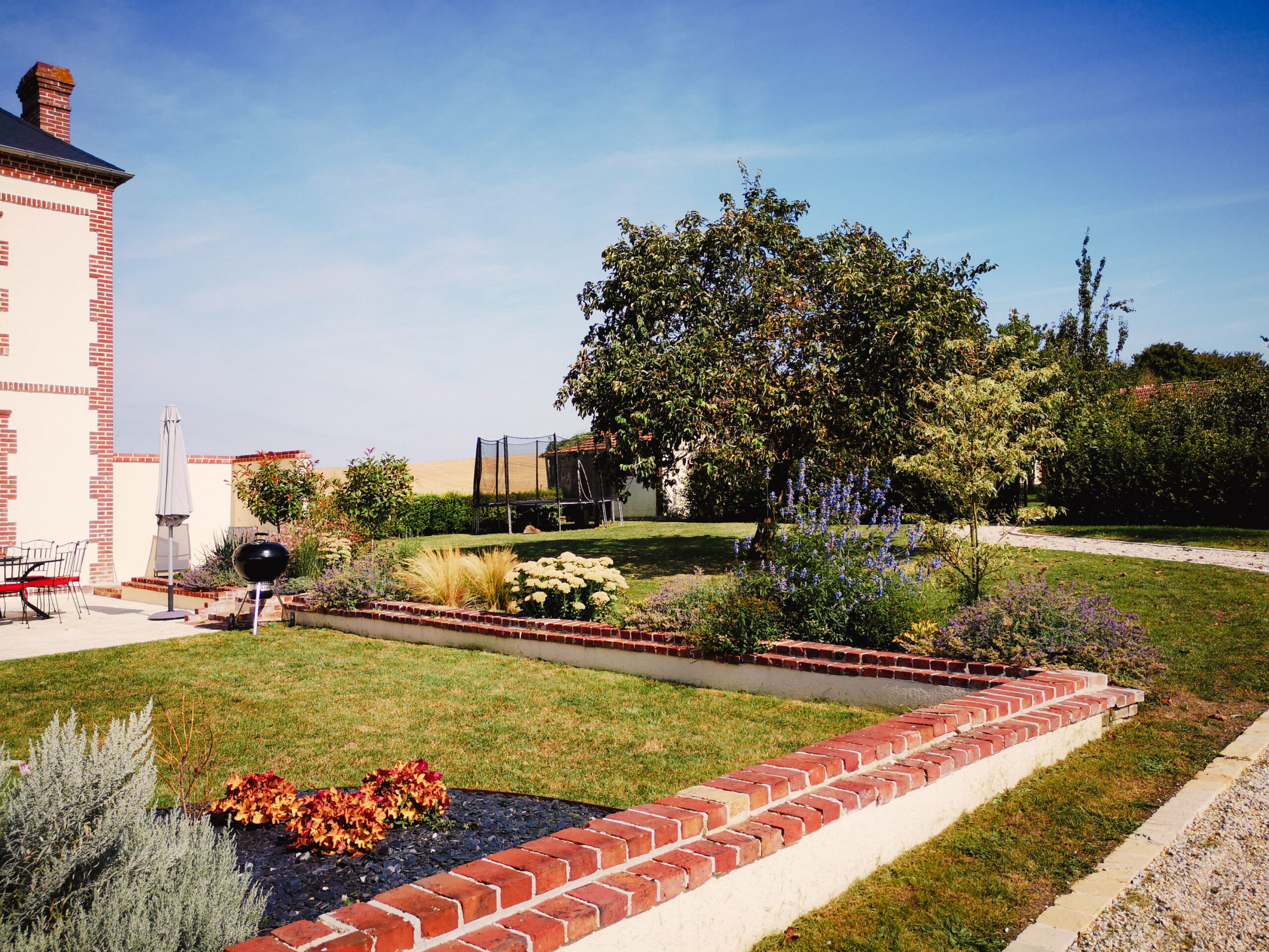 Il manquait de l’intimité dans ce jardin de campagne. La vue, vers les champs de moutons devait être maintenue, les vents d’est maitrisés. Pour profiter donc pleinement de la terrasse, un mur à l’angle droit fut créé. Destiné à un futur barbecue, aujourd’hui ce petit espace sert de solarium.