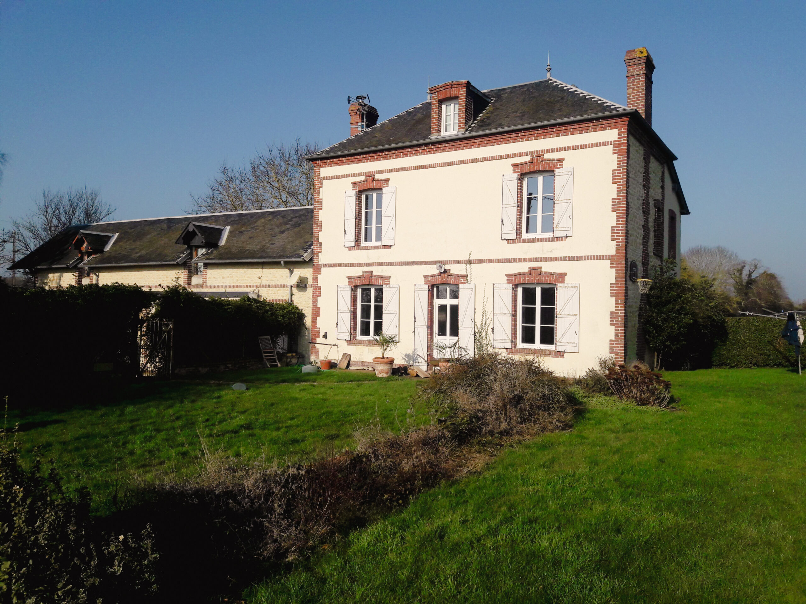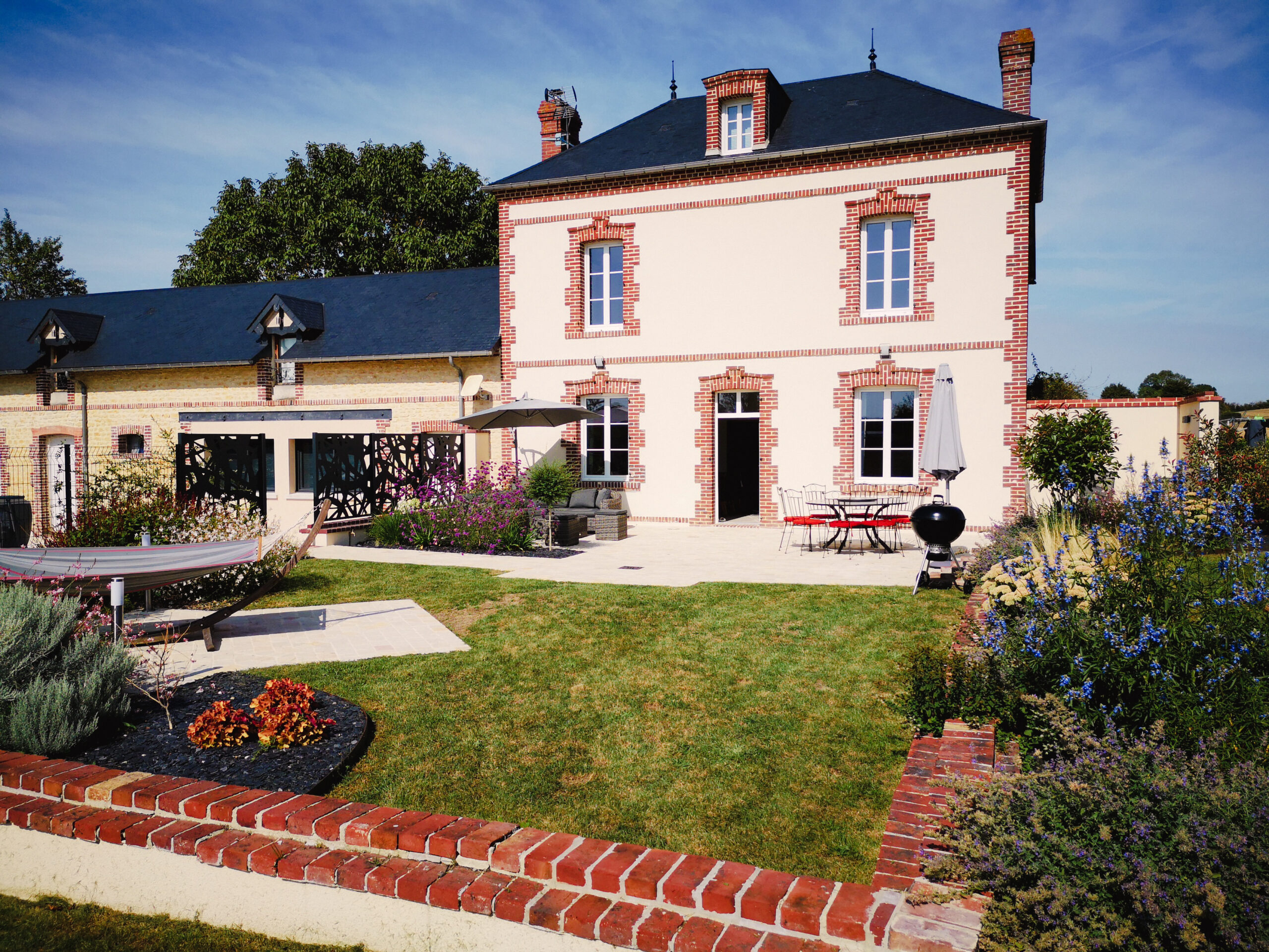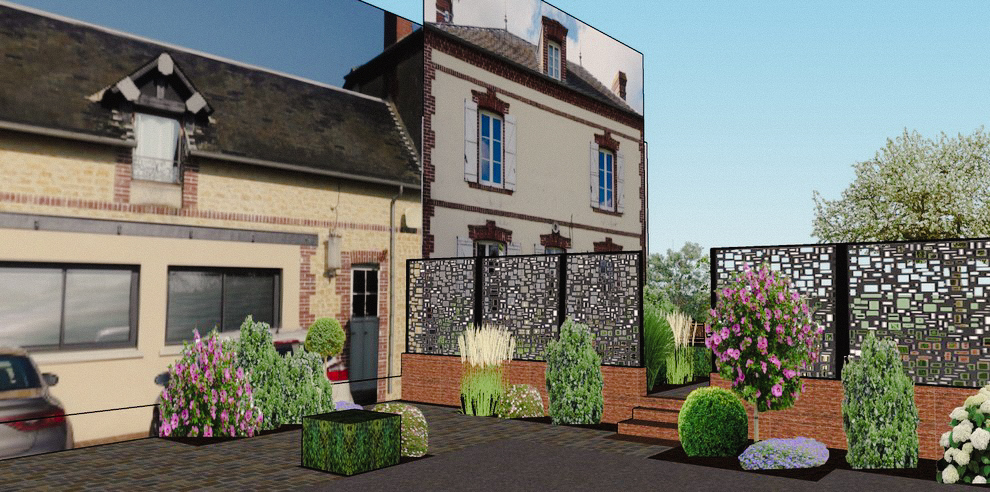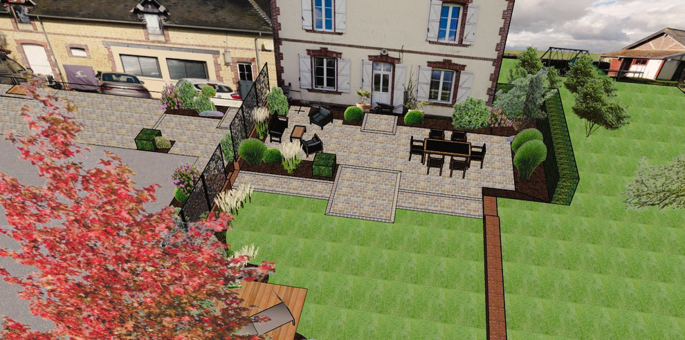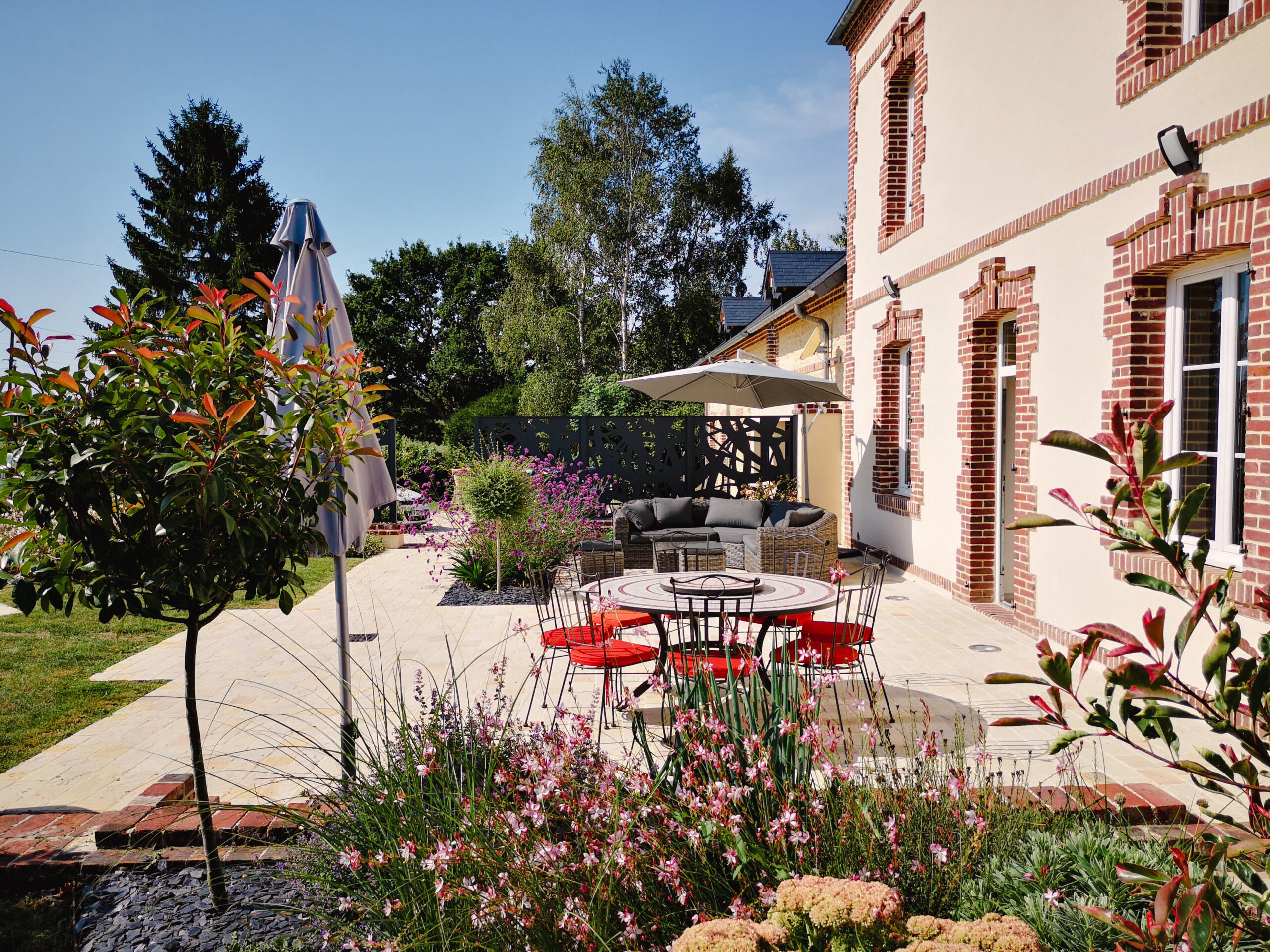 Une grande terrasse fut créée en y intégrant un massif pour le coin détente. Une terrasse, plus petite offre du recul sur la maison. L’entrée en partie basse n’était pas visible: grâce à un dallage, le problème est résolu.