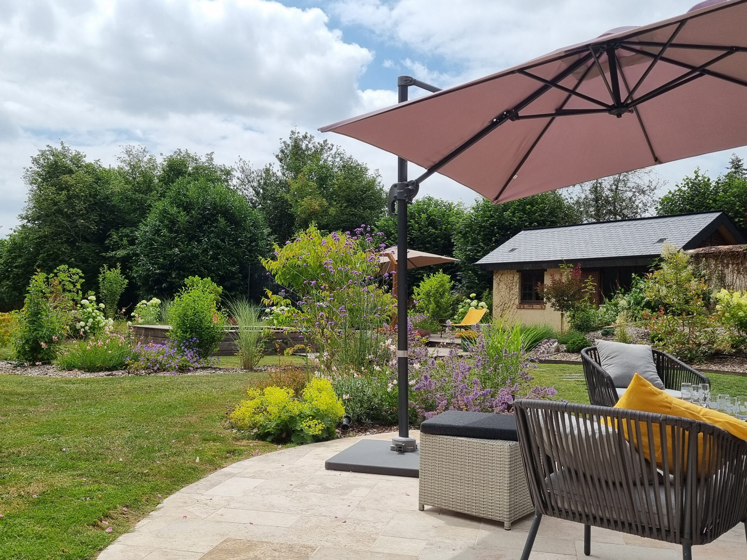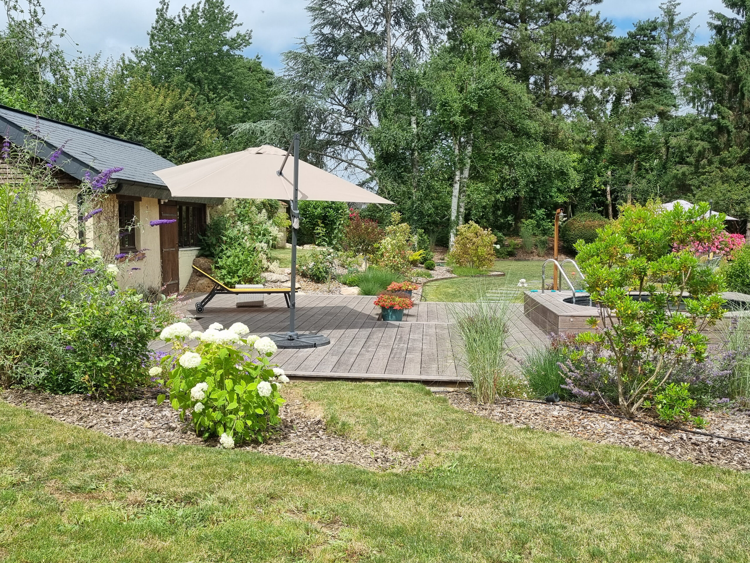 Des terrasses en lames de bambou sur 2 niveaux pour accompagner le dénivelé donne du caractère à ce jardin de campagne autour de Lisieux.