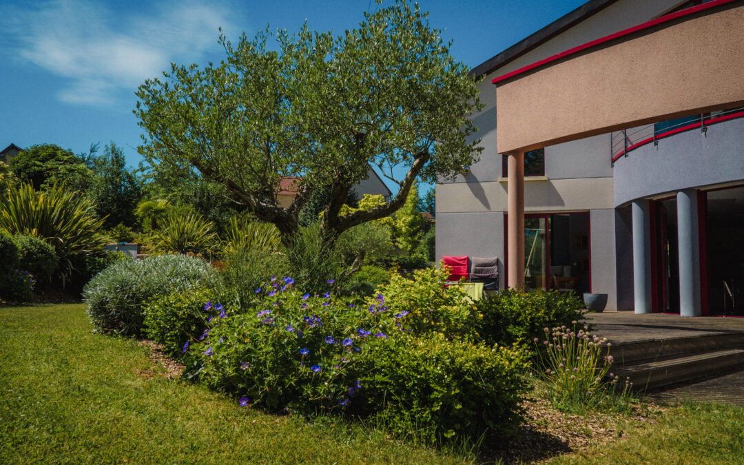 Jardin avec talus approche Ce grand jardin entièrement crée pour cette maison d’architecte très moderne, était sur 2 niveaux. Un champ de pommiers en partie haute et une grande terrasse de plain-pied en partie basse. L’intégration d’une piscine était le souhait des...