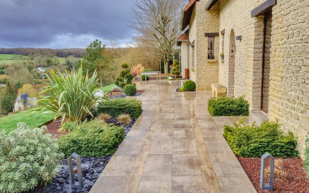 Terrasse pour une vue imprenable approche La terrasse de cette grande et longue maison surplombant la vallée, manquait de largeur. Il fallait redéfinir les dimensions pour éviter l’effet couloir. L’ajout d’un autre matériau, ici la terrasse en composite surélevée...