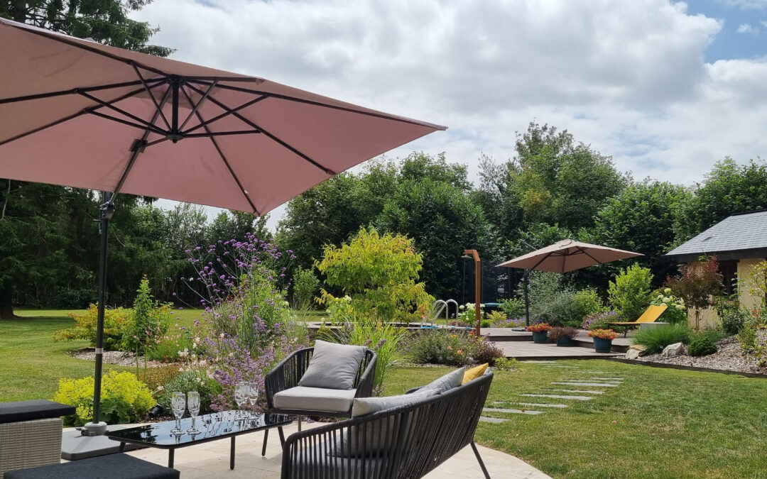 UN JARDIN RAFRAICHISSANT  approche La cliente souhaitait profiter d’un jardin avec un espace dédié à la détente autour de l’eau si possible. La solution : l’installation de « LA BARÏK française », ronde de 3 m de diamètre où 12 personnes peuvent profiter...